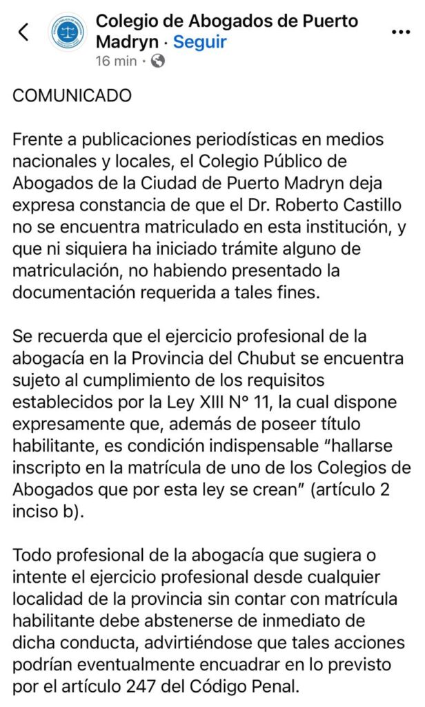El Colegio Público de Abogados de la ciudad de Puerto Madryn emitió este martes un comunicado oficial en el que aclaró que el Dr. Roberto Castillo no se encuentra matriculado en esa institución, y que además no inició ningún trámite de matriculación ni presentó la documentación requerida.